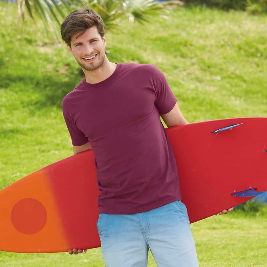 ściągacz wokół wykroju szyi, taśma wzmacniająca od ramienia do ramienia, podwójne szwy wokół szyi, przy rękawkach i u dołu koszulki, bez szwów bocznych